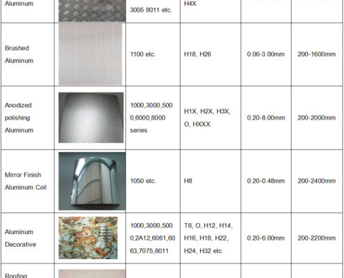 2000 Series: 2017 2124 2219 3000 Series: 3003 3004 3105 3102 4000 Series: 4043 4032 4047 5000 Series: 5005 5052 5083 5154 5754 5182 6000 Series: 6061 6063 7000 Series: 7075 7079 8000 Series: 8011 8006 8079 |
